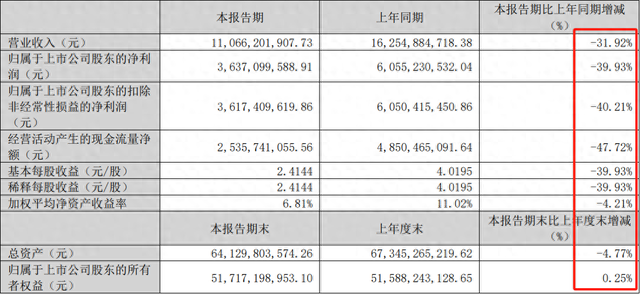 公司2025年一季度营业收入为110.7亿元,同比下降31.9%;归母净利润为36.4亿元,同比下降39.9%;扣非归母净利润为36.2亿元,同比下降40.2%。